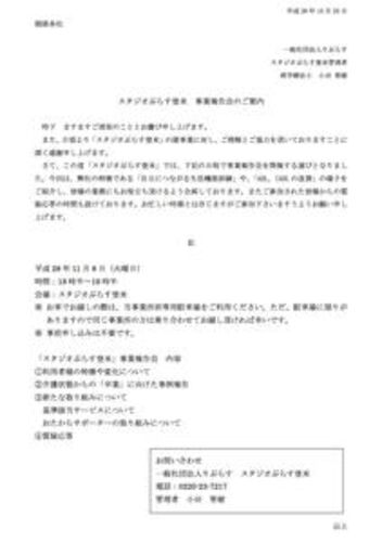 スタジオぷらす登米より【事業報告会開催】のお知らせです。 日ごろ応援してくださる皆さまへ感謝の気持ちを込め、利用者様の変化やデイサービスからの「卒業」に向けた取組事例などをお話させて頂きます。ご都合がつきましたら是非ご参加くださいまようお願…