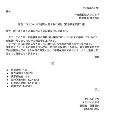 いつもお世話になっております。 本日、石巻事業所の従業員1名が、新型コロナウイルス陽性と確認されましたので、ご報告させて頂きます。 そのため、8月12日まで臨時休業となり、8月16日より再開予定とさせて頂きます。 なお、濃厚接触者は0名であり、学習ス…